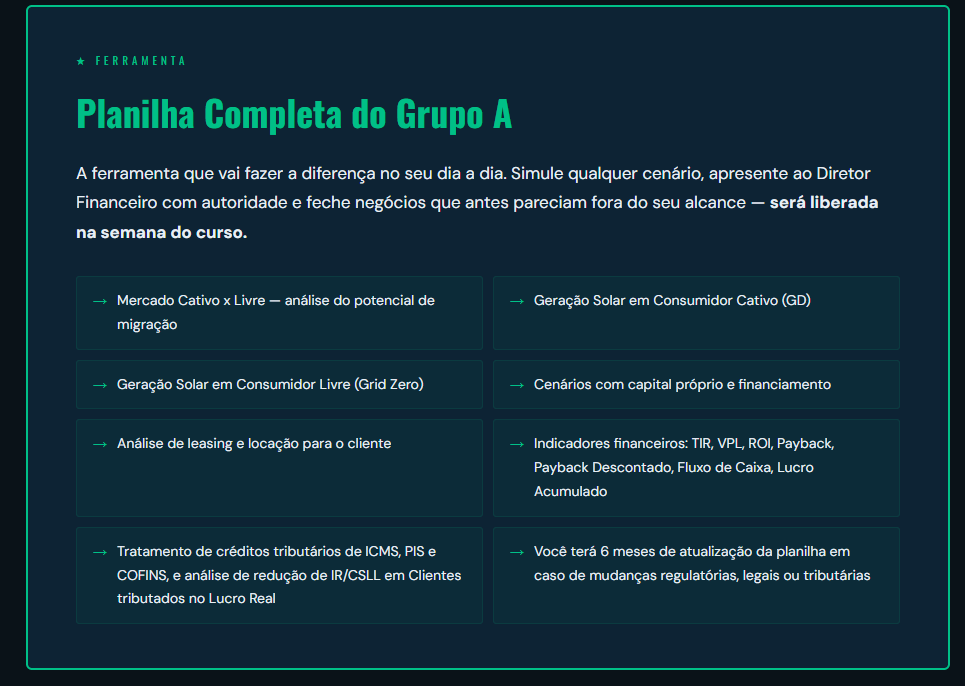 Cursos de energia solar ensinam técnica. Este curso ensina a vender no nível em que o Grupo A opera. Você vai aprender a falar com o Diretor Financeiro — não com o gerente de manutenção. Vai saber a diferença entre apresentar um projeto solar e apresentar um investimento solar com retorno calculado.