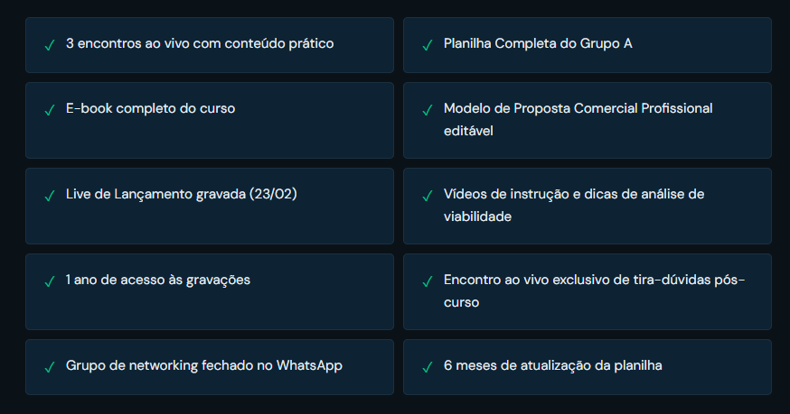 E vai receber as ferramentas para fazer isso na prática: planilha de viabilidade completa, modelo de proposta profissional e o método de abordagem para clientes corporativos do zero ao fechamento.